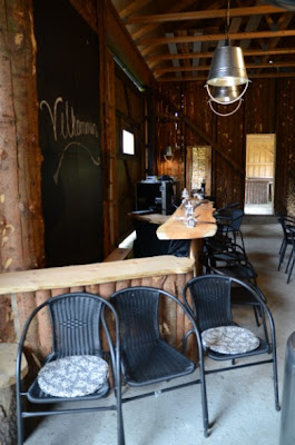 Eine veggen i lokalet. Sjå til høgre, heile den veggen er av stabla ved.